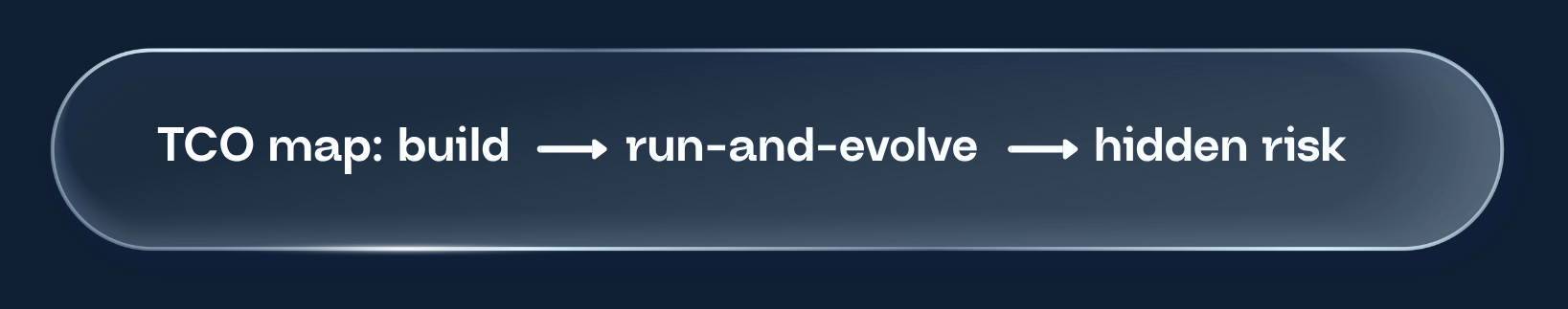 One must also consider the total cost of ownership (TCO), which falls into three stages: building the core, running and evolving in production, and managing the hidden risks that subtly erode ROI when adoption lags.