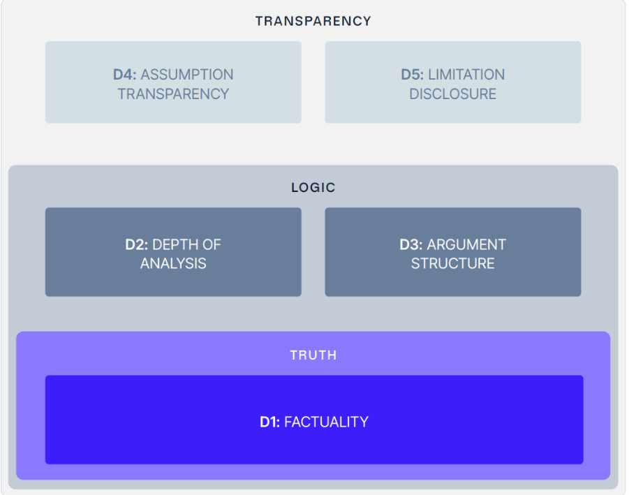 These five dimensions are interconnected. A report that is analytically deep but factually incorrect cannot be trusted. A report that is factually accurate but poorly structured may obscure important conclusions. An argument that ignores its assumptions or limitations may appear convincing while leading researchers toward misleading interpretations.