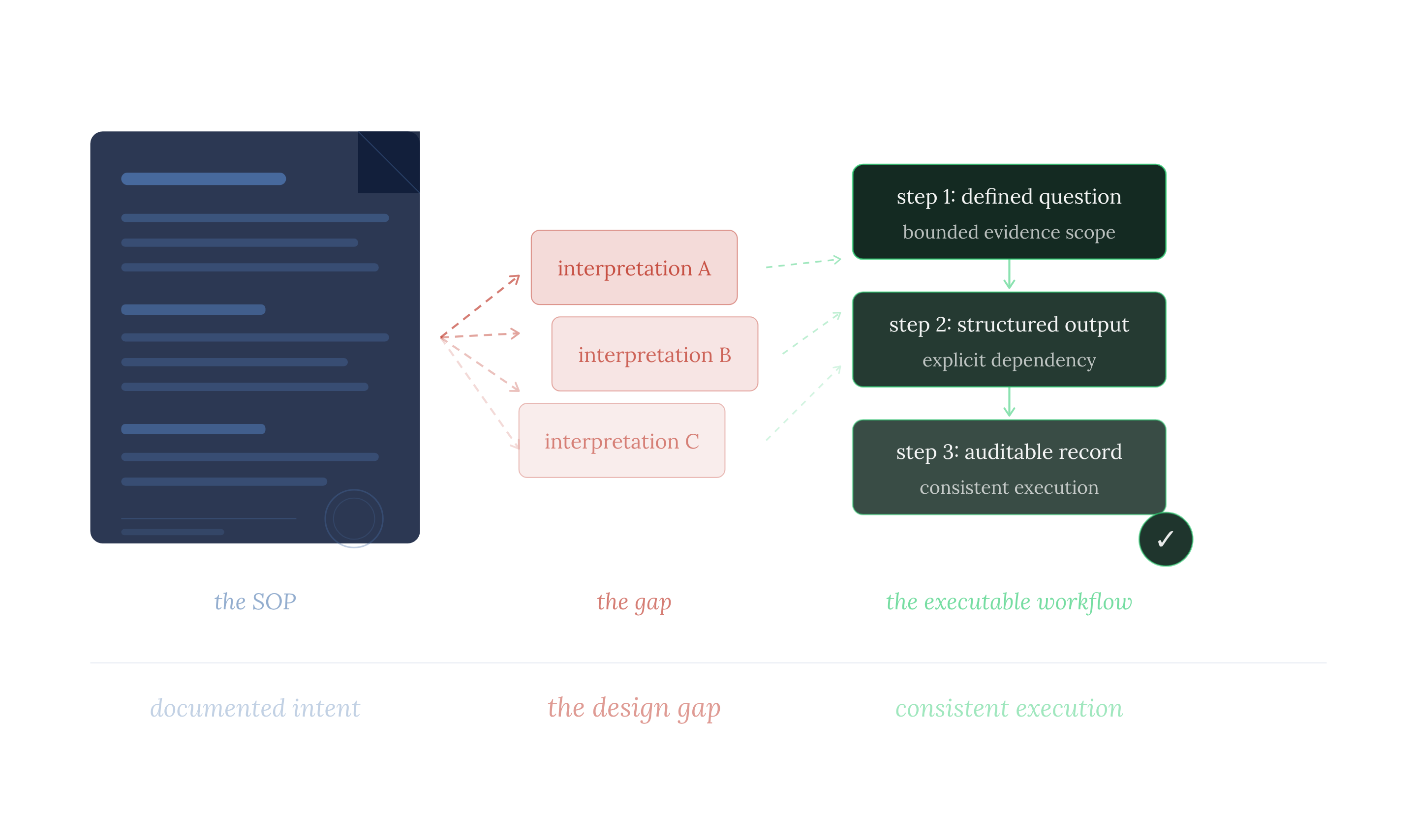 The gap between a documented SOP and an executable workflow is a gap in design, not in effort or rigour.